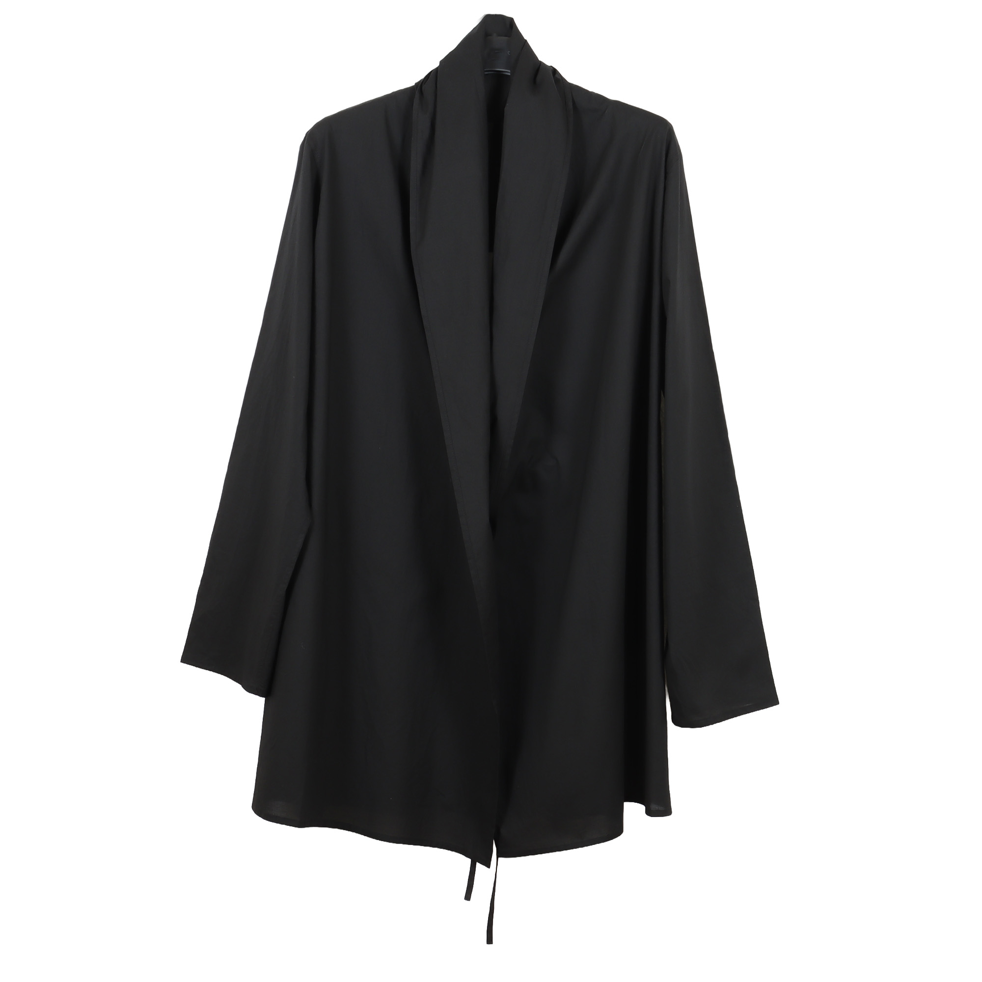 Lange Blusenjacke mit Schalkragen und Bindegürtel in schwarz. Langarm und 29 cm hohe seitenschlitze machen dieses Modell zum optimalen Begleiter für Business-Kleidung an heißen Tagen. Rückenlänge bei Gr. M: 83 cm. Material und Pflege: 100 % BW. Schonwaschgang.