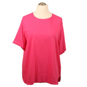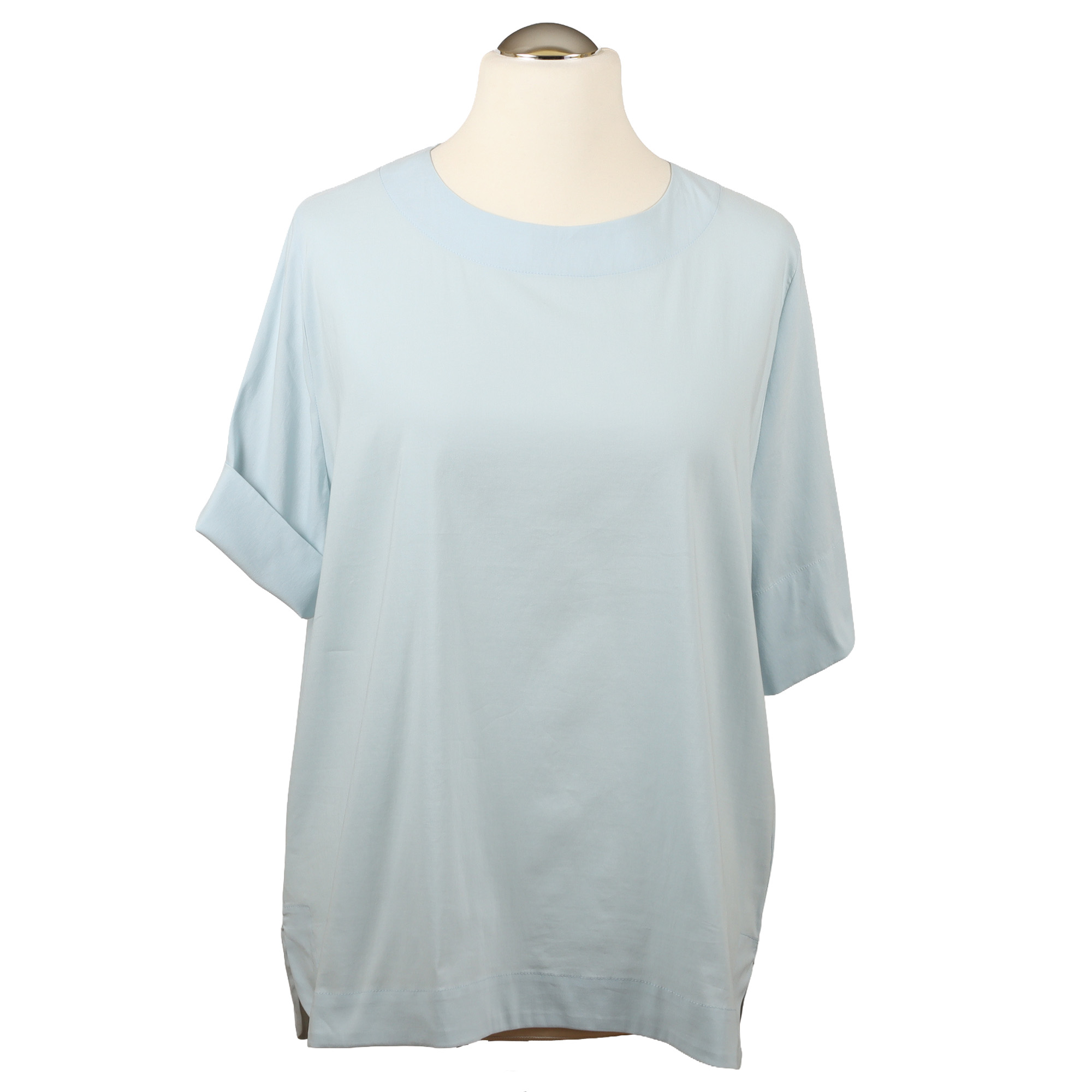 Rundhalsshirt in hellem Bleu mit 5cm mehr Rückenlänge, abgerundeten Seitenschlitzen und krempelbaren halben Ärmeln. Der praktische 1 Knopf Rückenverschluss schont die Frisur. Rückenlänge bei Gr. M: 72 cm. Material und Pflege: 70 % BW, 26 % PU und 4 % Elastan. Schonwaschgang.