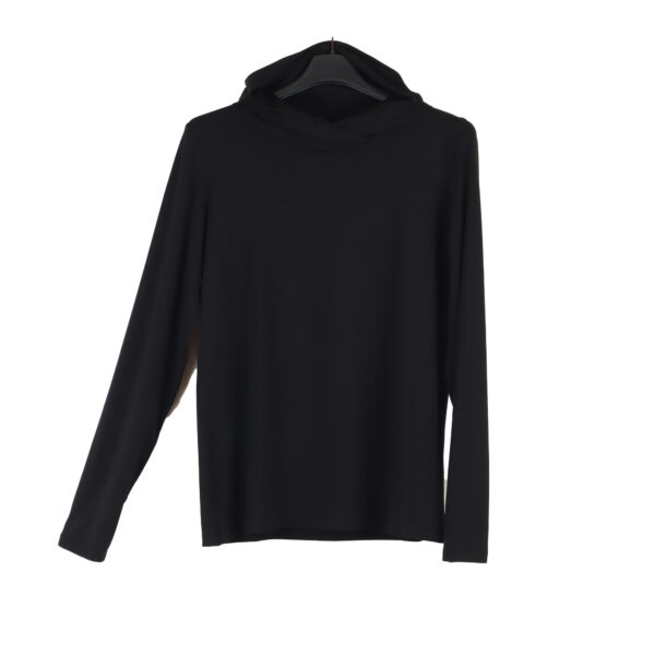 Gerade geschnittenes schwarzes Kapuzenshirt mit 1/1 Arm. Länge bei Gr. s: 61 cm. Material und Pflege: 63 5 Lyocell; 31 % Cotton, 6 % Elastan. Schonwaschgang.