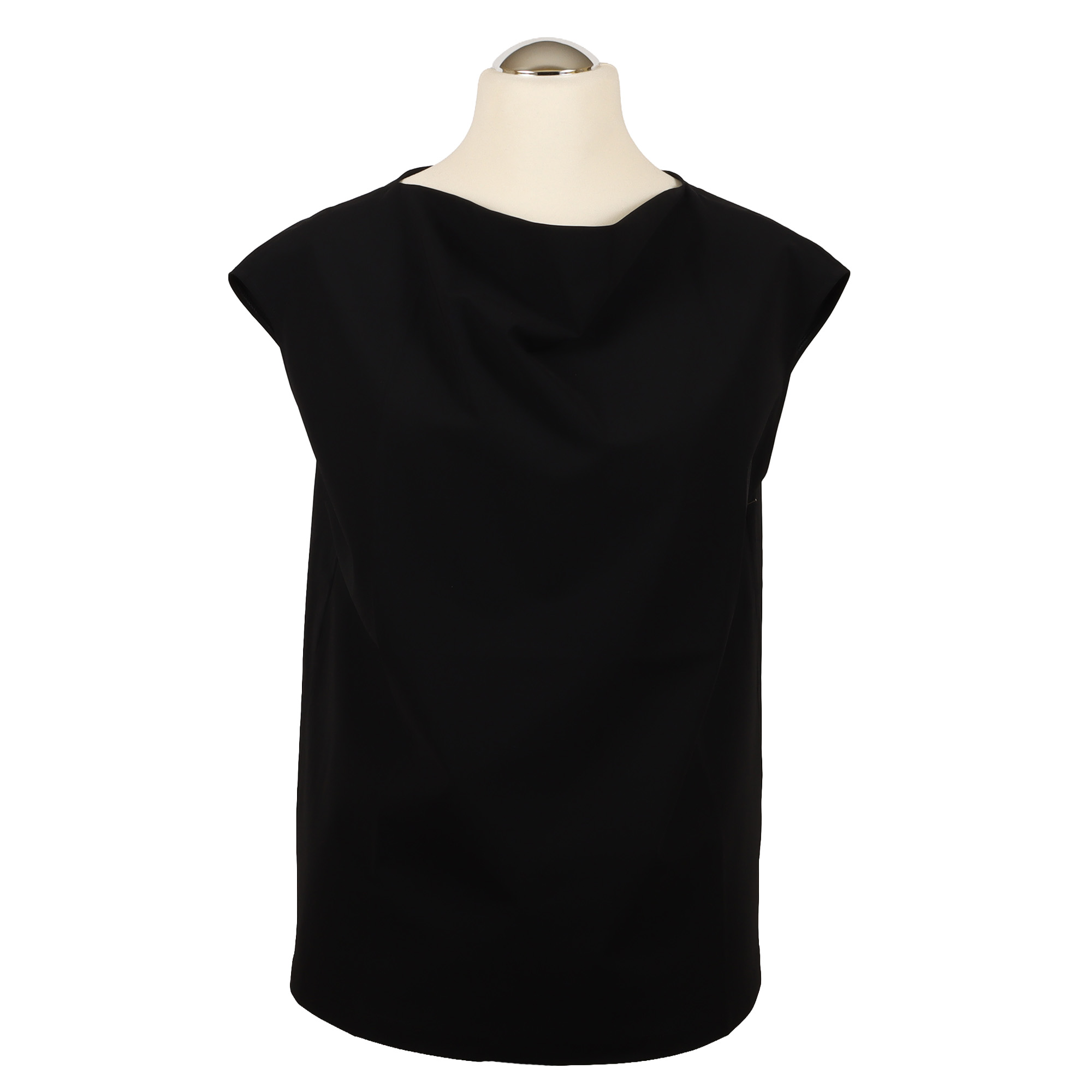Gerade geschnittenes sommerliches Top in Schwarz mit angedeutetem Wasserfallkragen in feinster Krepp-Optik passend zu Hose 1200-901. Rückenlänge bei Gr. M: 61 cm. Material und Pflege: 79 % recycled PA, 21 % EL. Schonwaschgang.